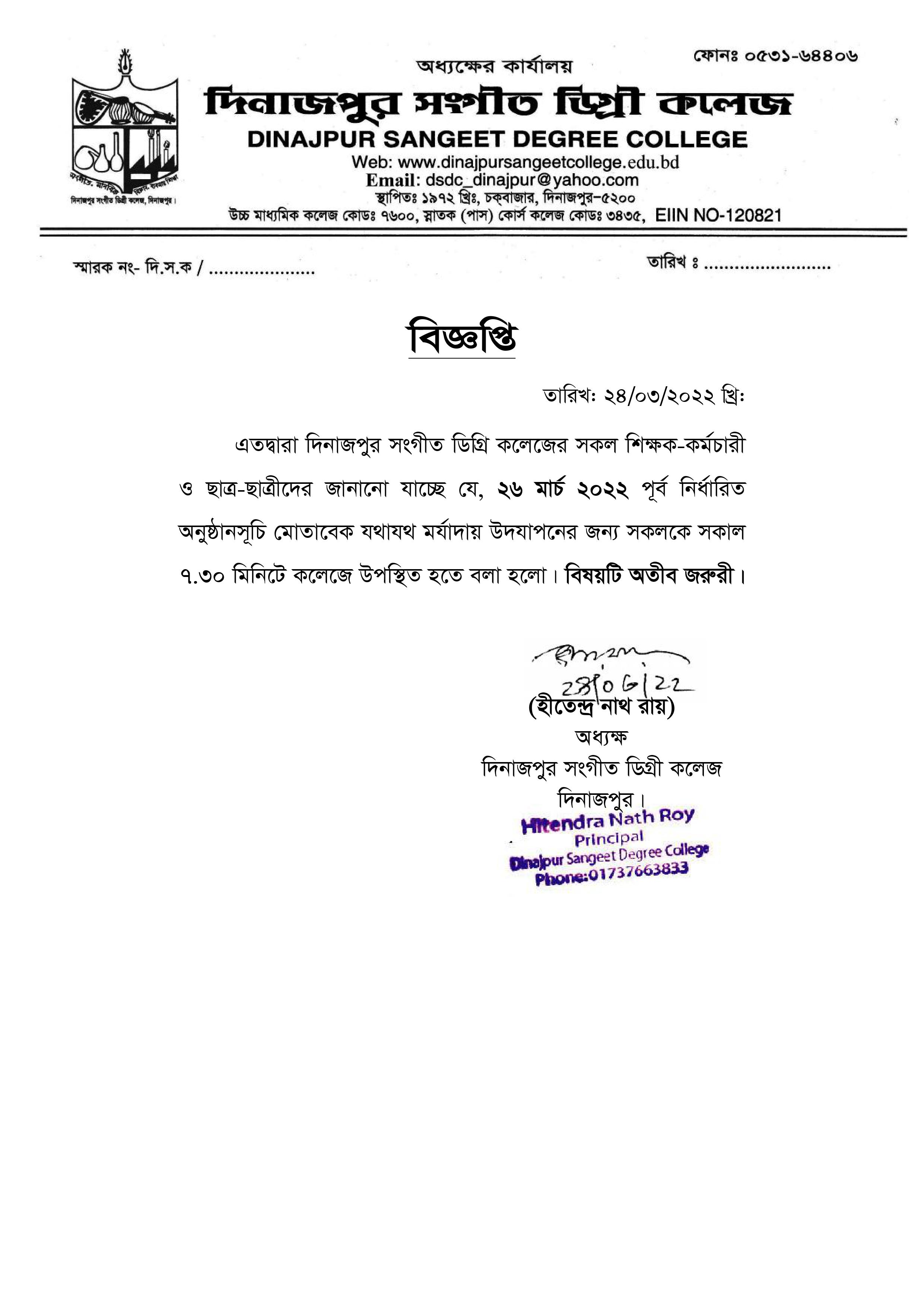 E-mail: dsdc_dinajpur@yahoo.com Facebook: facebook.com/দিনাজপুর-সংগীত-ডিগ্রী-কলেজ-100363341788810 Phone: 0531-64406