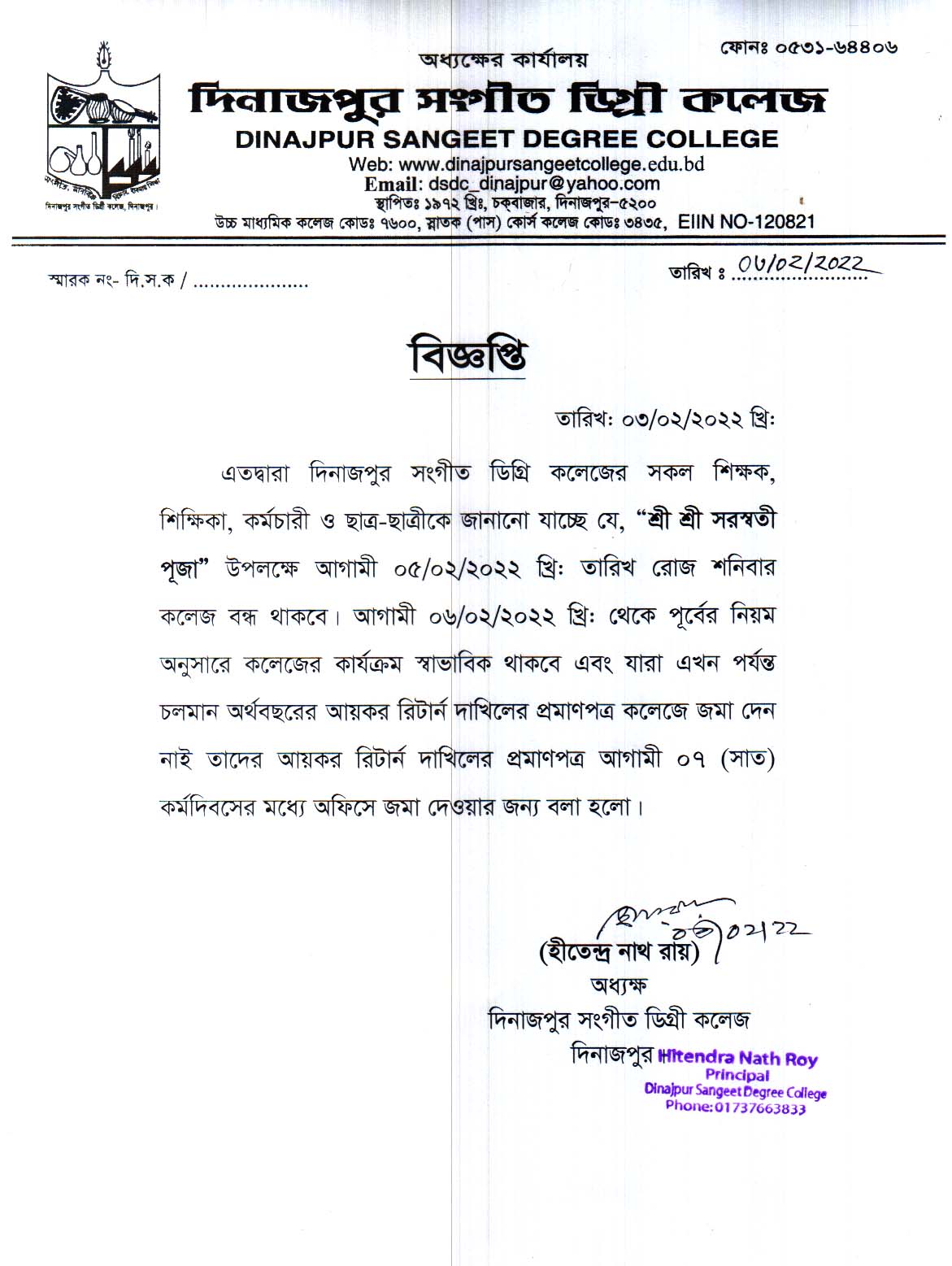 E-mail: dsdc_dinajpur@yahoo.com Facebook: facebook.com/দিনাজপুর-সংগীত-ডিগ্রী-কলেজ-100363341788810 Phone: 0531-64406